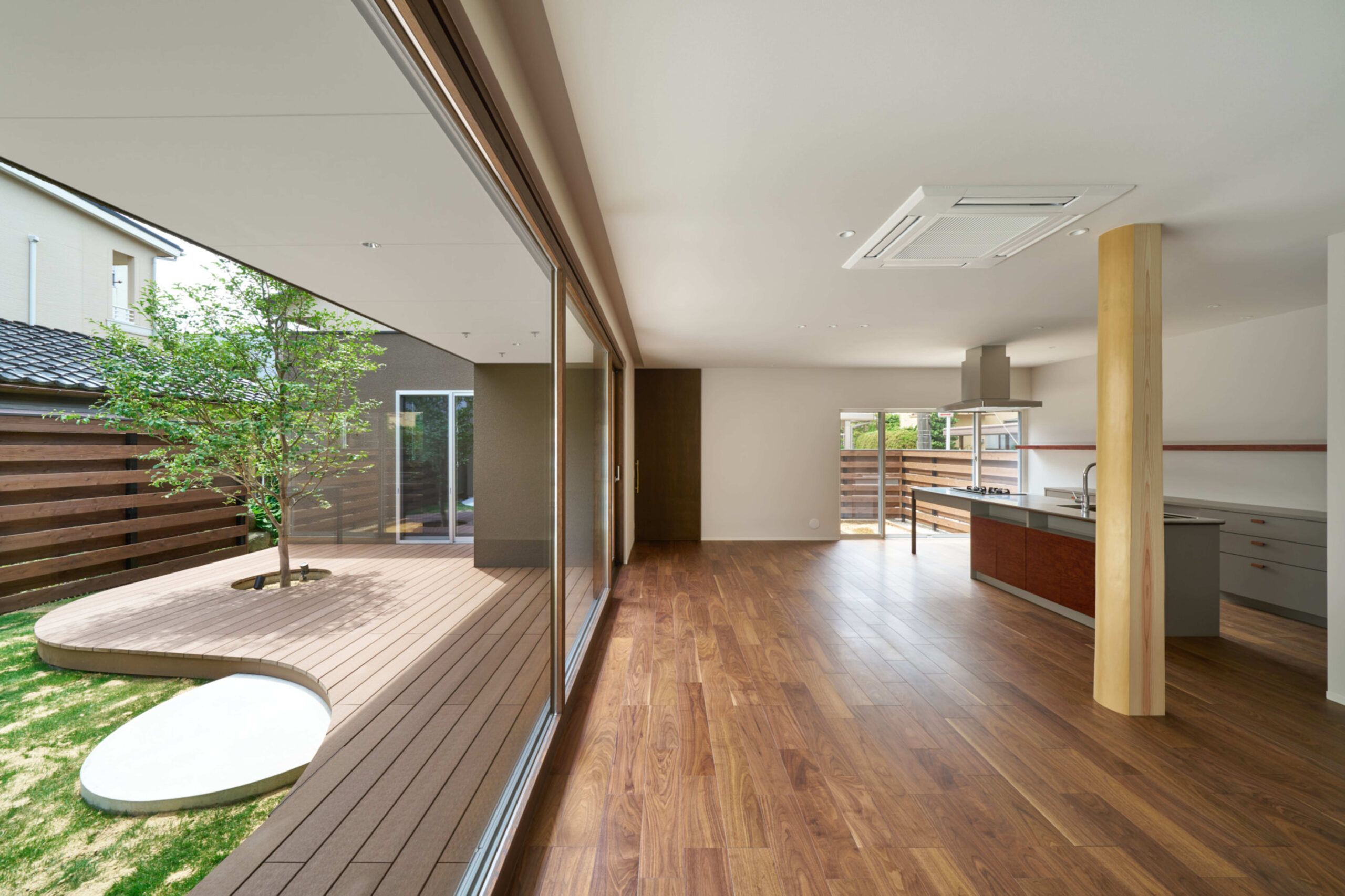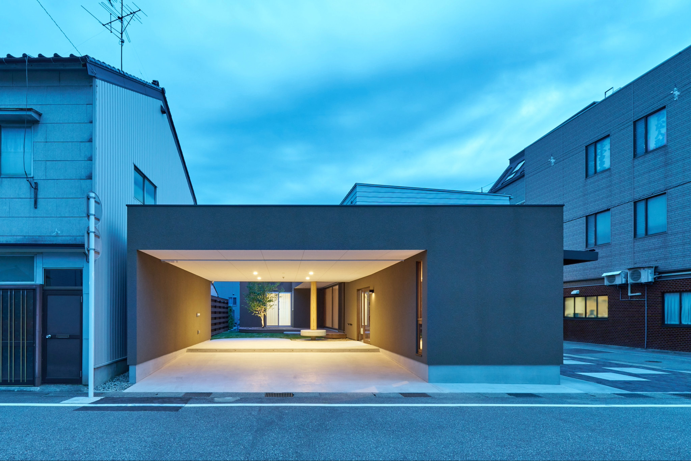 この住宅でひと際目を引くのは、住宅のタイトルにもなっている開放的なガレージとそれと連続する中庭です。幅6m、奥行き7.5mと余裕をもたせたガレージは、手前の駐車スペースと奥の屋根付き外部スペースを10㎝の床の段差のみで分節しており、また、ガレージのモルタル仕上げが中庭に、中庭の芝がガレージに一部越境することで、相互の境界を曖昧にし、一体感を高めています。大黒柱の周りの丸いモルタルベンチも場を作る良いアクセントになっています。このように道路に開かれた外部空間は、通りの景観に奥行きを持たせ、表出したアクティビティが通りに賑わいを与えることで街並みに寄与しているといえます。玄関と物置はガレージと角のアプローチスペースの間に配され、双方から出入りできるようになっています。玄関を入ると、階段を含むエントランスホールがあり、その先には中庭と全面開口で視覚的に中庭と連続する開放的なLDKスペースが続きます。道路側からガレージ越しの視線と、リビングから中庭への視線は直交しているので、プライバシーを確保しながら、中庭との連続性を満喫できるようになっています。2階は、中庭に面した廊下のようなスタディスペースが将来の子供部屋を繋ぐようにコンパクトに配置されています。