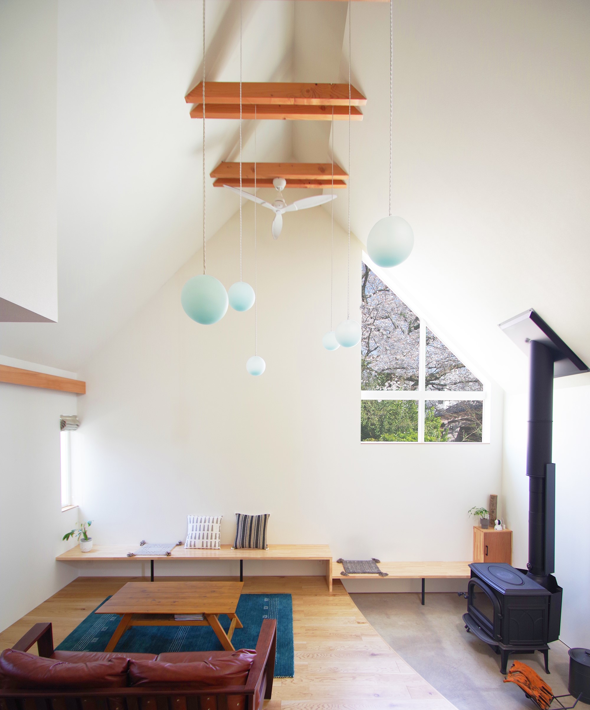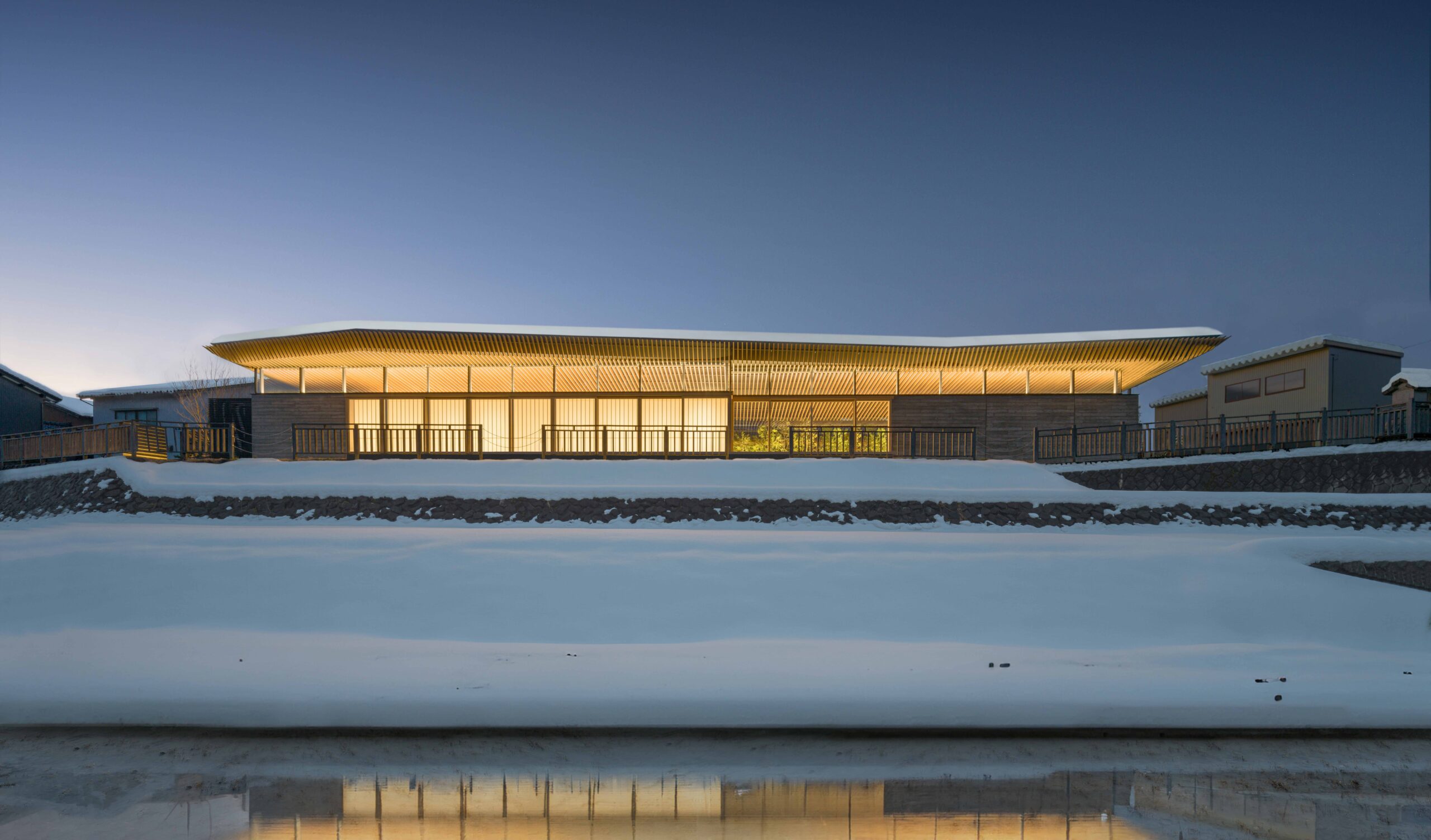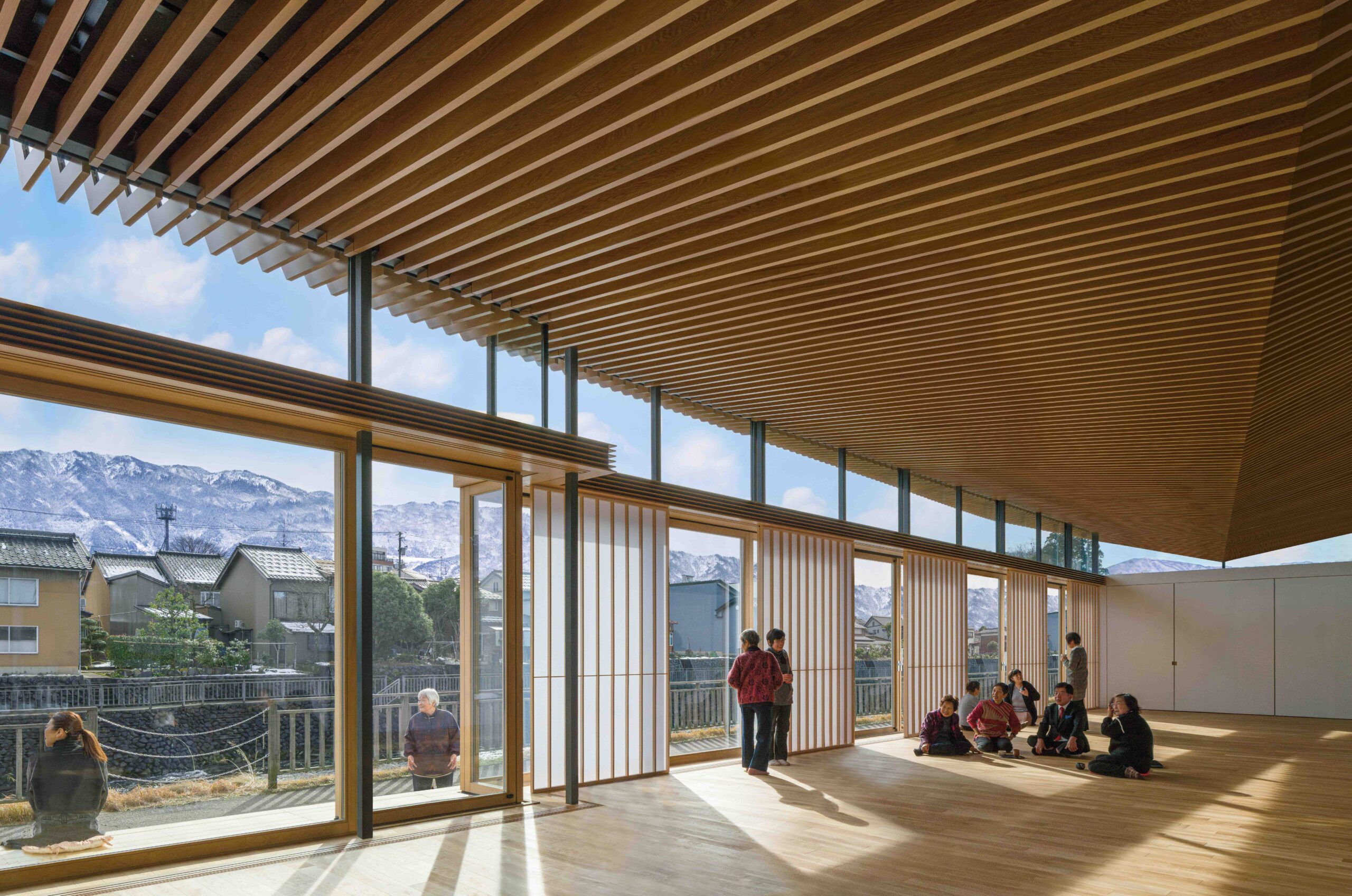 冬季の積雪が厳しく、高齢化が進む山間部の盆地において、利用者や近隣住民が安心して集うことのできる集会所の計画です。雪下ろしの負担をなくし、隣地や道路への落雪を防ぐため、積雪解析を行ったうえで折半谷型屋根を採用しており、その選択が建物の独自性ある外観と内部空間の形成につながっています。浮遊するように架けられた屋根と壁の間に生まれた隙間は、空や周辺の瓦屋根の風景を切り取り、内部に時間の移ろいを内包した多様な表情をもたらしています。