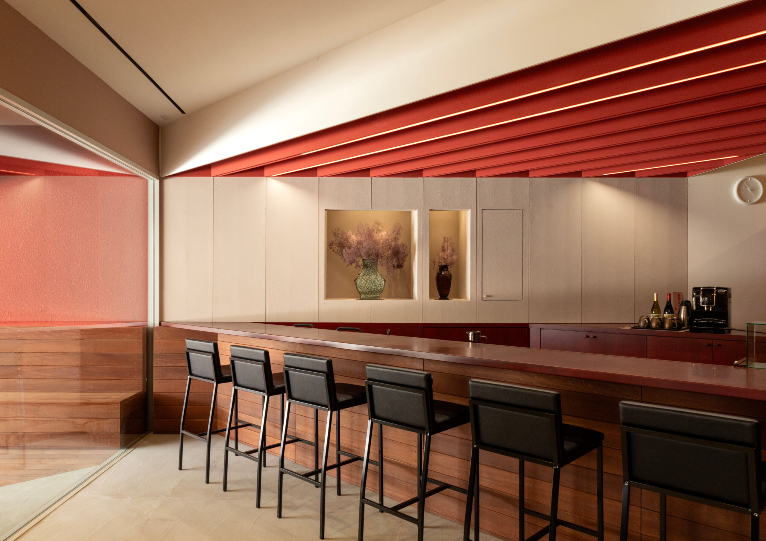 地域の文化的コンテクストから抽出した「赤」を基調としつつ、グレーや淡いピンクなどを組み合わせることで、落ち着きと洗練を備えた空間へとまとめられています。また、セットバック部分には大きなデッキを設け、まちの人々を迎え入れる縁側のような存在として機能するとともに、さまざまな活動を受け止める舞台ともなり、カフェと地域を結びつける重要な役割を果たしています。
