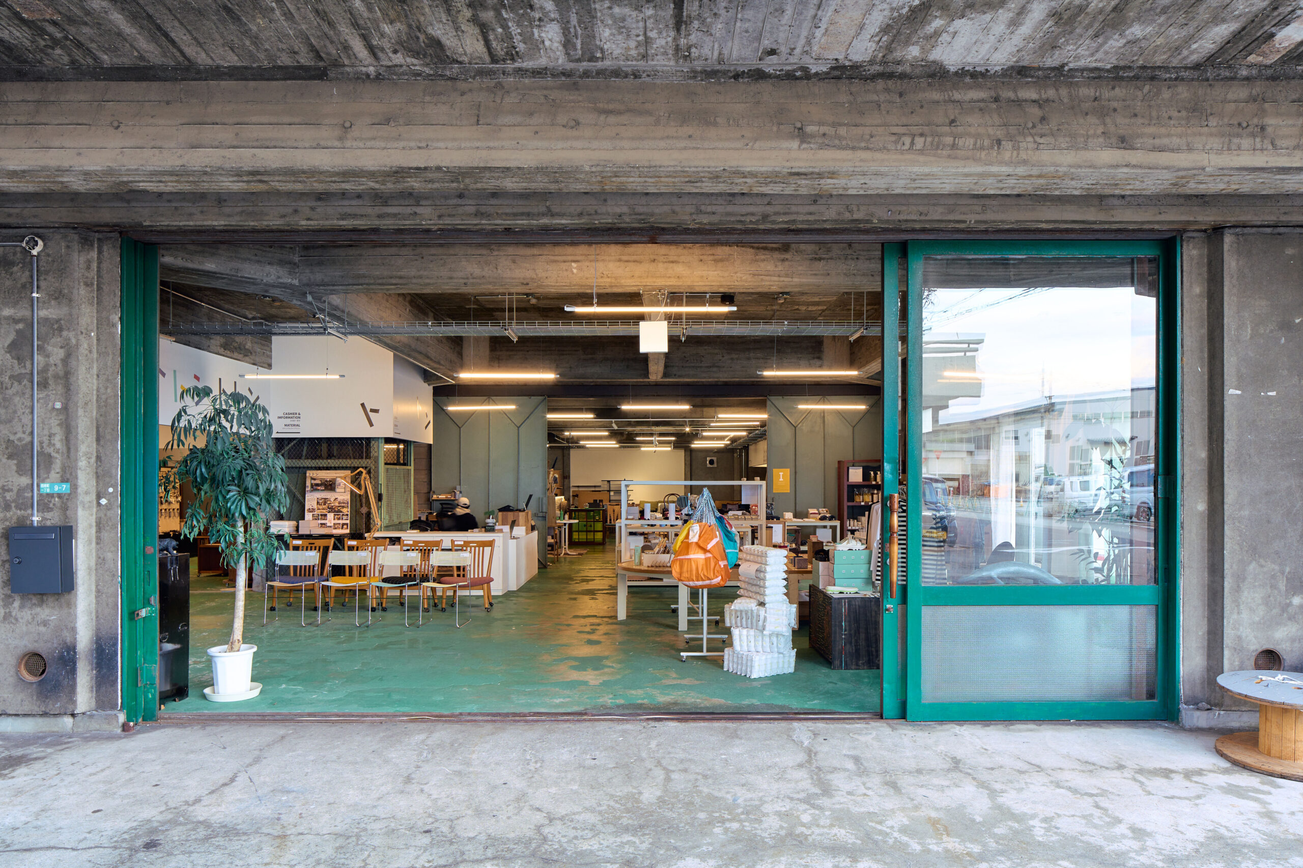 この建物はかつて老舗家具店の物流倉庫として、新しい家具を納品した際に不要となった家具が集められる場所でした。この家具店では時代が求める取り組みとして、集められた廃棄予定の家具を再生、資源循環の環にもどすプロジェクトを始動することになり、循環の環の出発点、またプロジェクトの発信地へとコンバージョンさせたものです。