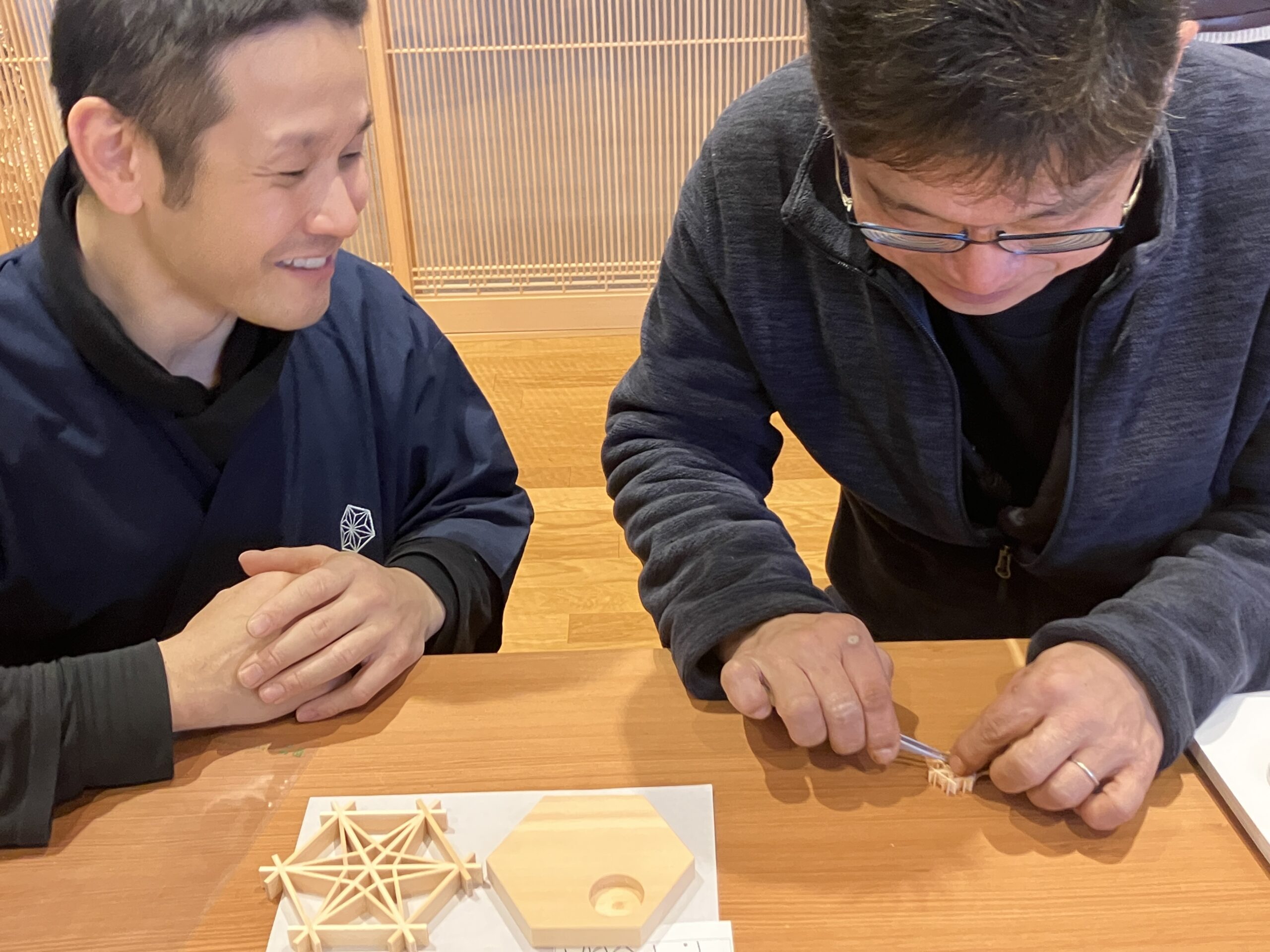 谷端社長からの会社紹介の後、参加者全員でミニ組子の製作体験を行いました。